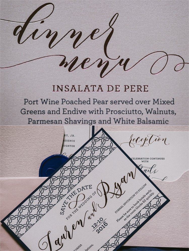 Persnickety was beyond thrilled to create such a unique stationery suite that incorporated beautiful tiny details for Lauren and Ryan. This couple opted for a light blush pocket with a tiny hint of shimmer and a deep navy bottom layer, both held shut with a custom navy wax seal that had been pressed with a tiny infinity seal, a meaningful symbol of their love that was carried throughout their entire wedding. Adding to the shimmer was the elegant rose gold foil that graced the printed layer of their invitation and a whimsical typestyle as memorable as this couple’s big day.